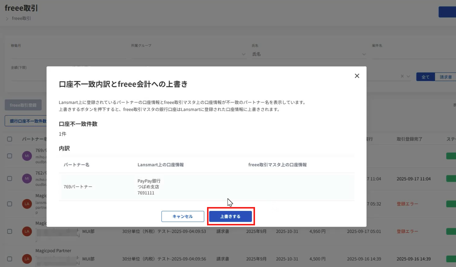 上書きを行うと、freee取引マスタ上の口座情報が更新されます。