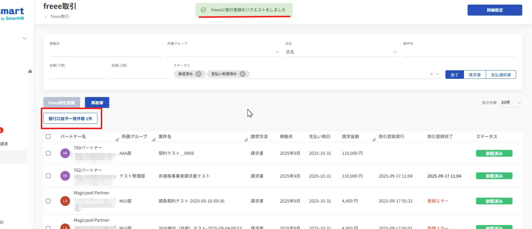 ※freee会計の取引先に口座情報が入っていない場合も、不一致として検知されます。