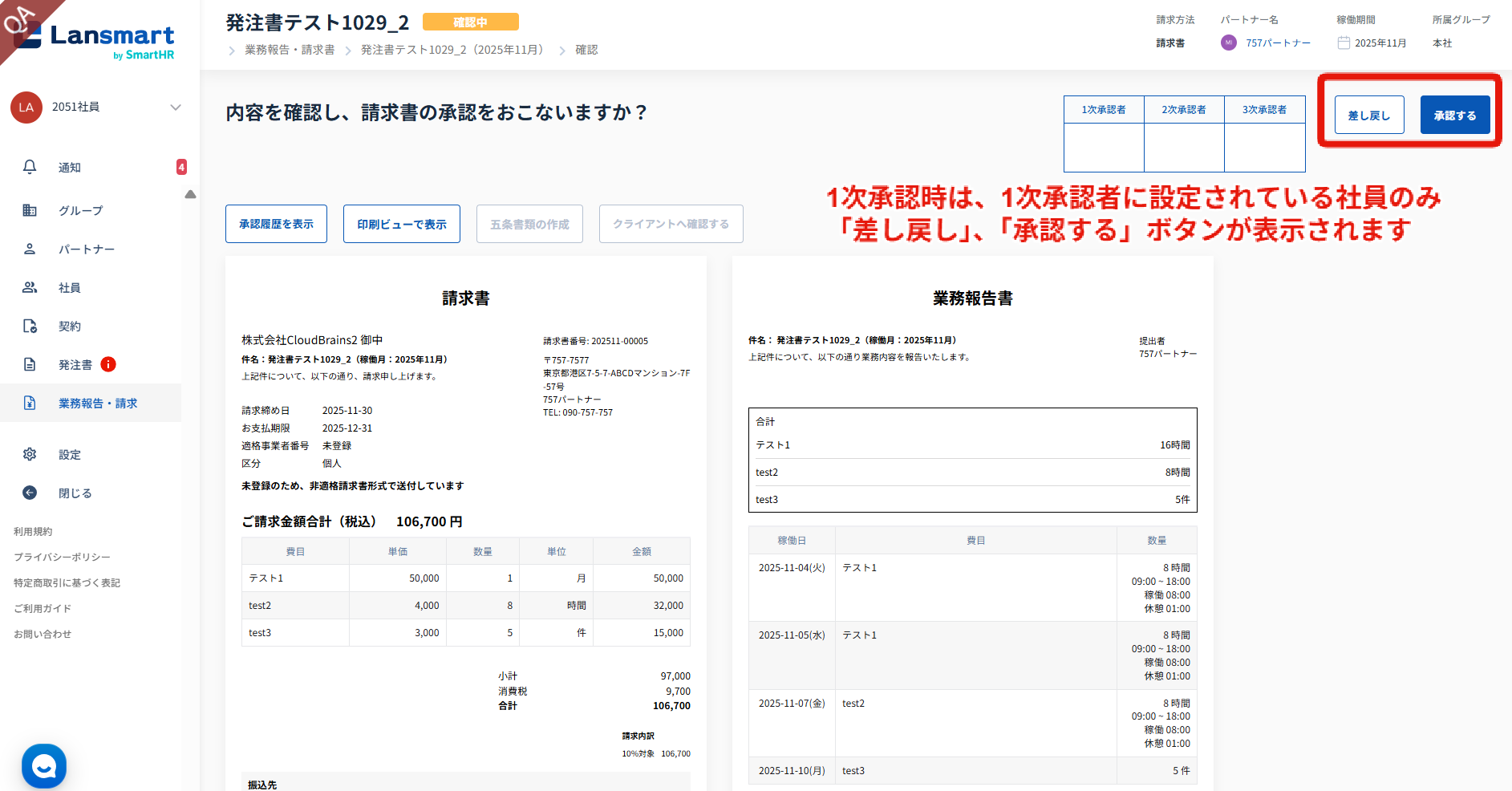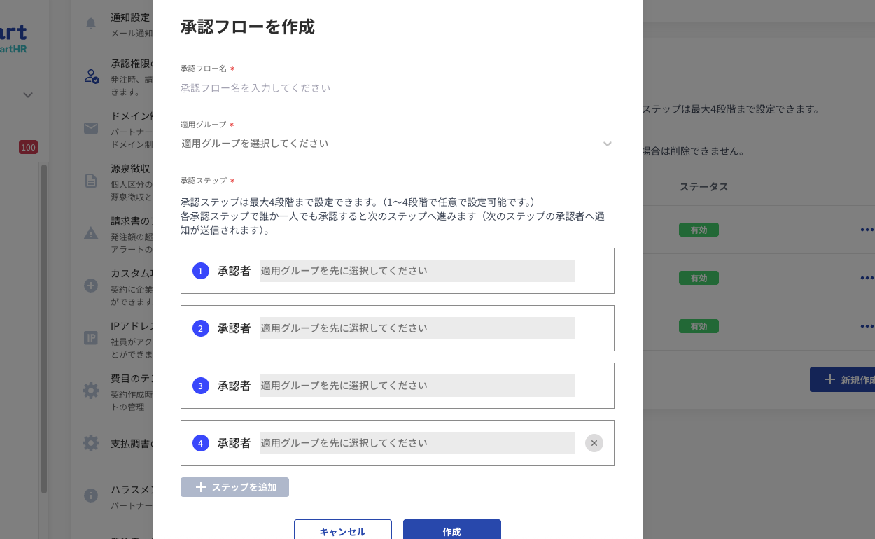 こちらの機能では、事前に設定画面で承認フローを設定しますと、パートナー様から送付された請求書を、複数の企業利用者が承認できます。
